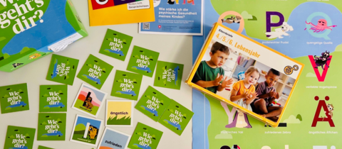Bestellen Sie bei uns eine Emotionen-Box, mit u. a. dem Kreide-Spass und dem Memo-Spiel, um die psychische Gesundheit von Kindern im Zyklus I spielerisch zu stärken. Ebenso enthalten sind Flyer mit Anlaufstellen für Eltern und Erziehungsberechtigte.