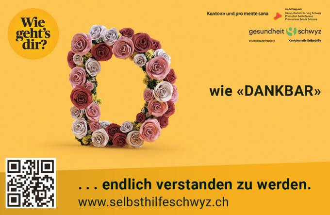 Derzeit sind an unterschiedlichen Stellen im Kanton Schwyz, wie im öffentlichen Busnetz, in Postfilialen, in den regionalen Zeitungen oder auch auf den Sozialen Medien einzelne Emotionen des Emotionen ABC der Kampagne «Wie geht's dir?» zu sehen, welche wir dafür einsetzen, um auf den positiven Nutzen der Gemeinschaftlichen Selbsthilfe aufmerksam zum machen. Die Kampagne «Wie geht's dir?» setzt sich für die Förderung der psychischen Gesundheit ein und trägt zur Enttabuisierung und Entstigmatisierung von psychischen Erkrankungen bei. Die Kampagne wird von der Stiftung Pro Mente Sana und allen Kantonen der Deutschschweiz – wie dem Kanton Schwyz- getragen. Auftraggeberin ist Gesundheitsförderung Schweiz. Das Emotionen ABC mit einer Vielzahl an Emotionen wie E wie Einsam oder G wie Gestresst lädt dazu ein, die eigenen Emotionen bewusster wahrzunehmen und einen guten Umgang damit zu finden. Selbsthilfegruppen ermöglichen einen offenen Austausch über die eigenen Emotionen und das eigene Wohlbefinden unter Gleichbetroffenen. Menschen in ähnlichen Lebenslagen oder mit ähnlichen Themen und Herausforderungen treffen sich in einem vertraulichen Rahmen, um persönliche Erfahrungen und Erkenntnisse zu teilen. Teilnehmende von Selbsthilfegruppen profitieren von dem Austausch und berichten von mehr Zuversicht, Selbstsicherheit und Motivation im Umgang mit ihrem Anliegen. Selbsthilfegruppen können einzelne Tools der Kampagne zur Stärkung ihres mentalen Wohlbefindens und für Gruppentreffen einsetzen. Hierzu gehört das Emotionen ABC und die entsprechenden Tipps zum Umgang mit Emotionen, sowie Gesprächstipps, um über Belastendes zu sprechen oder auch die Impulse zur Stärkung der Psyche. Hier geht's zur Kampagnenseite wie-gehts-dir.ch Medienberichte zum Tag der Selbsthilfe 2025 Wir danken dem Bote der Urschweiz und dem March Anzeiger für die gelungen Berichte über den Nutzen von Selbsthilfegruppen:Selbsthilfe ist vielseitiger, als viele denken, Bote der Urschweiz, 21. Mai 2025Selbthilfegruppen bieten Erleichterung, March Anzeiger, 21. Mai 2025
